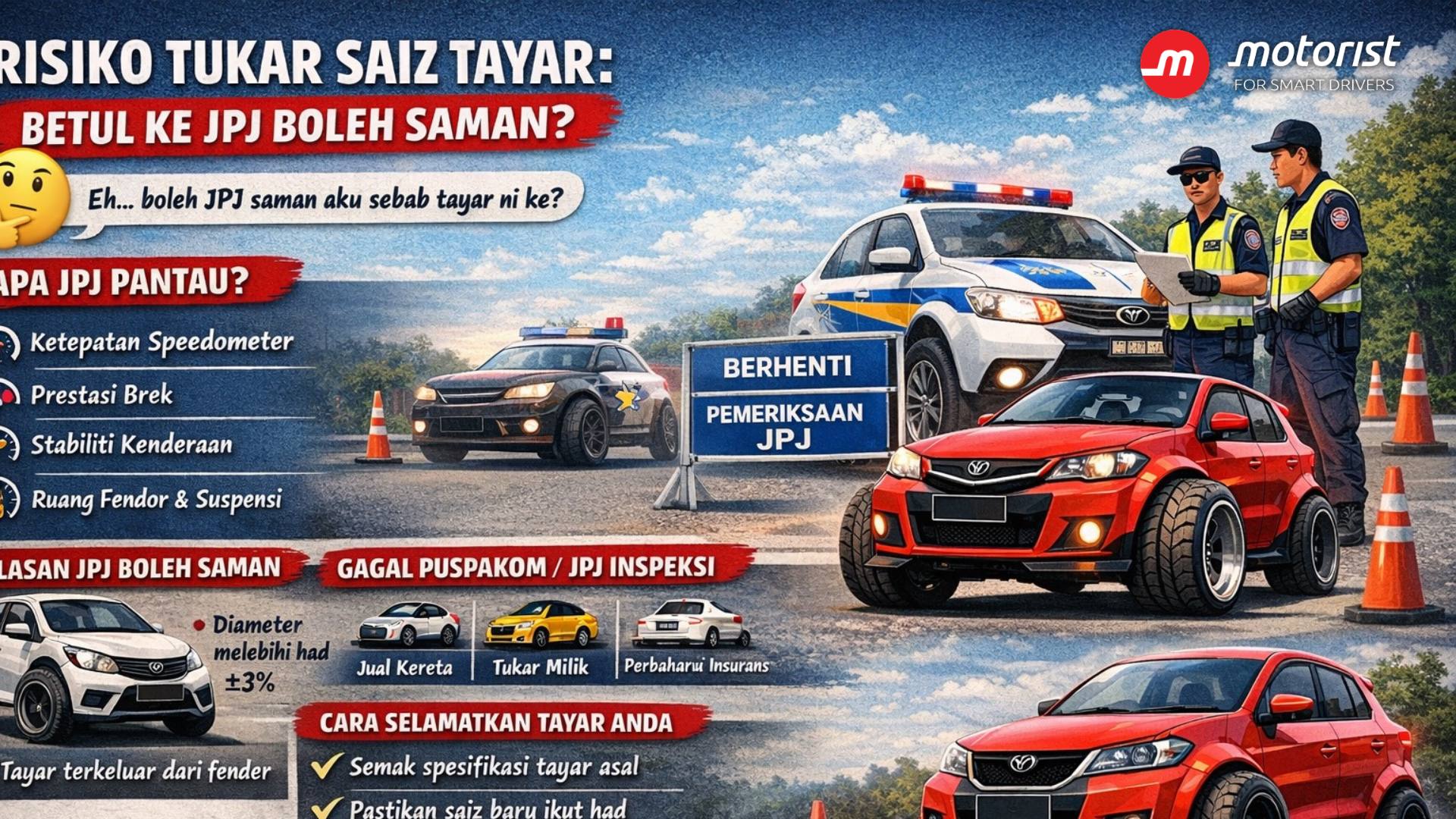Anda baru sahaja tukar tayar standard kereta anda. Lebih lebar. Lebih tinggi. Memang nampak cantik. Kemudian tiba-tiba nampak sekatan jalan raya JPJ dan terus terlintas di fikiran:
